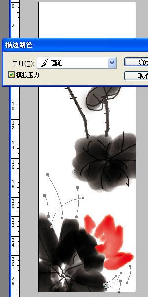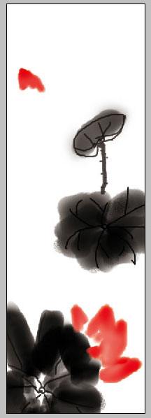 3、现在开始画了,尺寸、布局可以事先在纸上画一下,也可以找幅国画借鉴下。 调节画笔的大小、透明度画出荷花的叶子。
