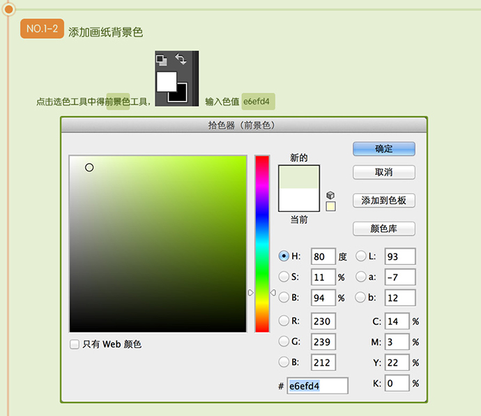 点击选色工具中得前景色工具,输入色值 e6efd4
