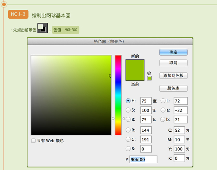 先点击前景色 ,色值:90bf00