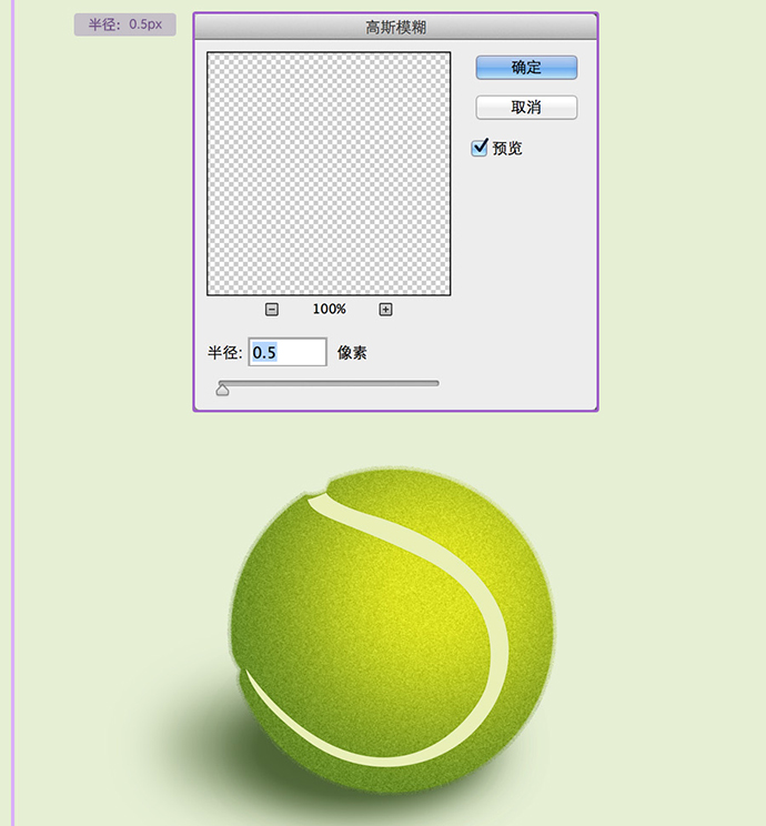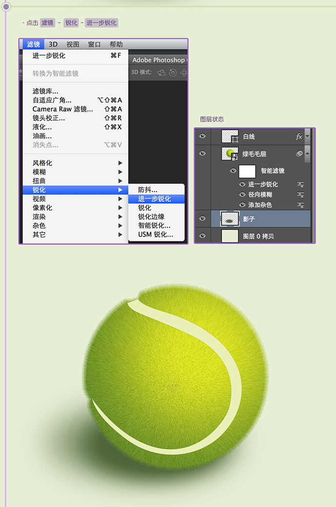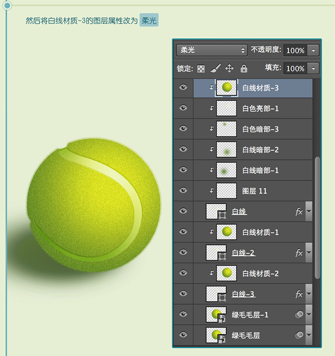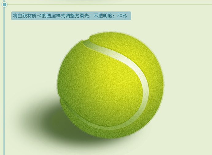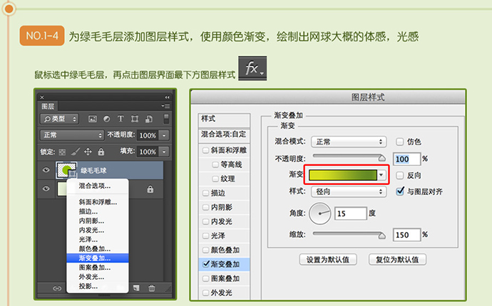 为绿毛毛层添加图层样式,使用颜色渐变,绘制出网球大概的体感,光感。