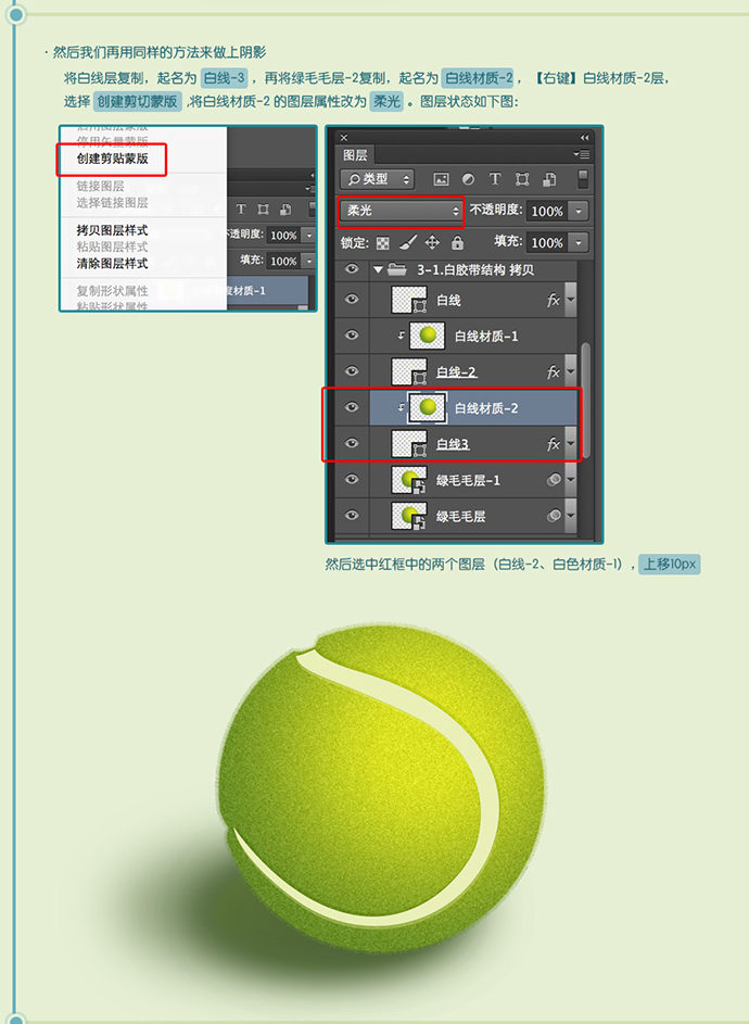 选择创建剪切蒙版 , 将白线材质-2的图层属性改为柔光。图层状态如下图。