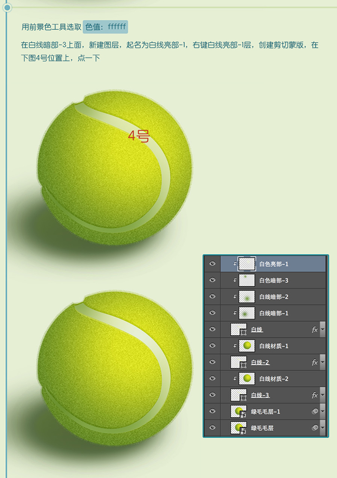 在白线暗部-3上面,新建图层,起名为白线亮部-1,右键白线亮部-1层,创建剪切蒙版,在下图4号位置上,点一下。