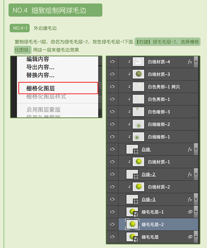 复制绿毛毛-1层,命名为绿毛毛层-2,放在绿毛毛层-1下面.【右键】绿毛毛层-2,选择栅格化图层;用这一层来做毛边效果