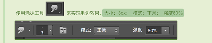使用涂抹工具来实现毛边效果,大小:3px; 模式:正常;强度80%