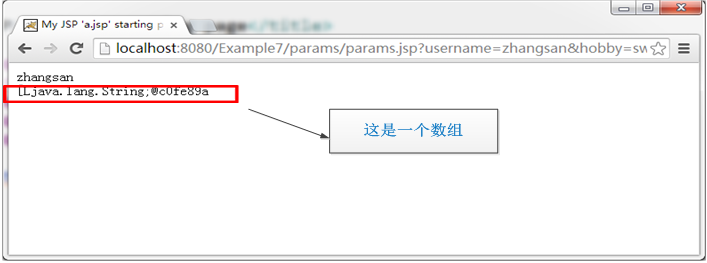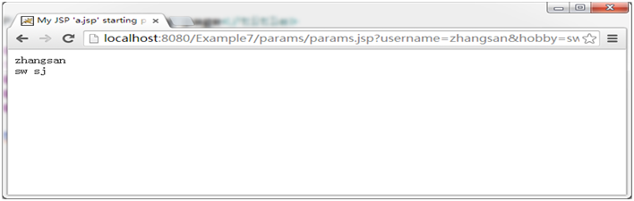 (4)在浏览器端访问:http://localhost:8080/Example7/params/params.jsp?username=zhangsan& hobby=sw& hobby=sj,浏览器显示结果如图1-2所示: