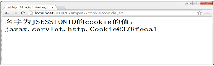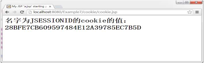将例1-6中的el表达式修改为“${cookie.JSESSIONID}”,再访问cookie.jsp,浏览器显示结果如图1-7所示: