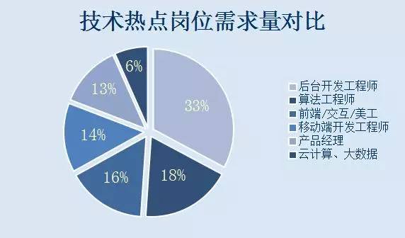 说完这个行业外的占比之外,咱们再来看看这个行业技术要求的占比需求。就程序员开发来说,有前端/交互/美工,后台开发,算法工程师,移动端开发,产品经理,云计算/大数据等等。接下来咱们看看先这个图的数据再分析。