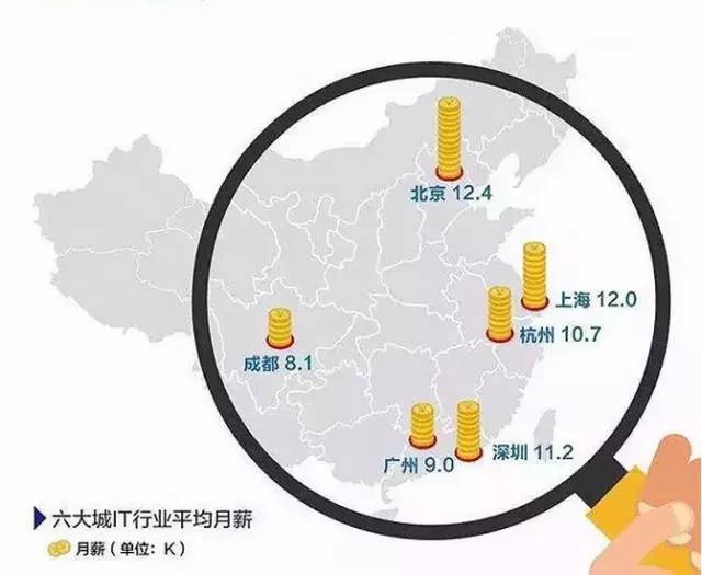 上图中就可以看出,6大城市IT行业平均的月薪,以北京最高,其次就是上海,接下来就是深圳,杭州,广州,成都,其次有追求IT从业者都会选择去北上广,因为他们有自己的追求,自己的理想。