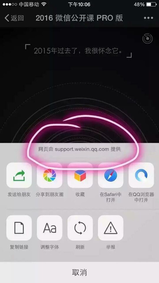 昨天晚上,小编的朋友圈被微信公开课PRO版的“我和微信的故事”刷屏了,但随之各种谣言出现了,有说这个应用是盗号的,更甚者还说,点进这个链接会把绑定的支付宝和银行卡里的钱转出……结果,紧接着,小编的朋友圈又被铺天盖地的“有人向你借钱请不要相信”之类的话刷爆了,对此,小编不以为然,因为小编深知:任何链接在打开前,点击右上角选复制链接或下拉页面,都可以看见网址,看到是什么.com即可,只要网址是正规网址,都没问题滴~~不要崇拜小编,小编只是免费IT课程听多了而已,嘎嘎~~